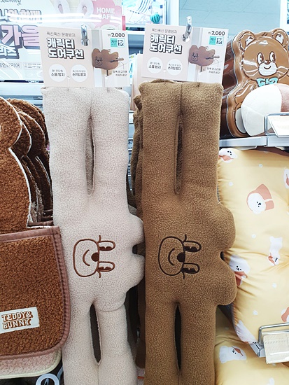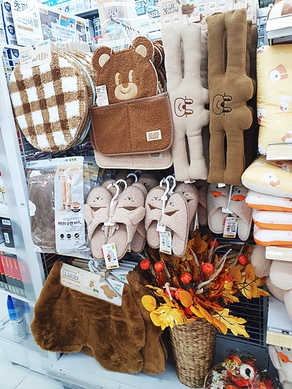 다이소 가을 신상이 작년에 비해 크게 눈에 띈 것이 생활제품류가 조금 더 늘었다는 점인데요 소음방지 및 문 손 끼임 방지를 위한 캐릭터 도어쿠션이 새롭게 출시되었고요 생활방수가 잘 될 것 같은 베개, 보들보들한 러그가 나왔더라고요 무엇보다 가을 분위기에 어울리게 갈색톤과 우드톤을 적절히 활용했고 옆으로 누군가를 사랑스럽게 쳐다보는 것 같은 귀여운 곰돌이의 캐릭터를 이용했다는 점이 특징이랍니다