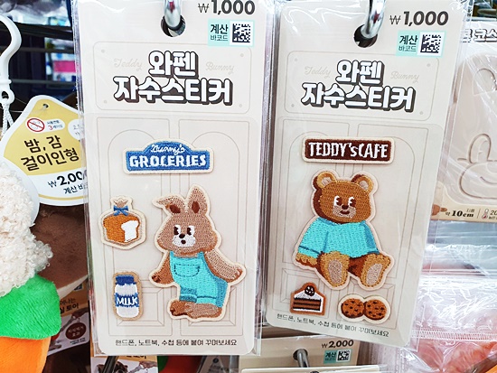 학생들에게 가장 인기많은 제품 종류가 액세서리류일 것 같은데요 자그마한 키링부터, 동전지갑, 스마트폰 스트랩, 쇼핑백 등이 있습니다 특히나 토끼와 곰돌이 캐릭터가 자수로 표현된 와펜은 의류에서부터 노트북 수첩 가방 등 두루두루 꾸미기용으로 활용하기에 아주 좋겠습니다 게다가 천 원이라는 착한 가격을 형성하고 있어 인기 일 것 같네요