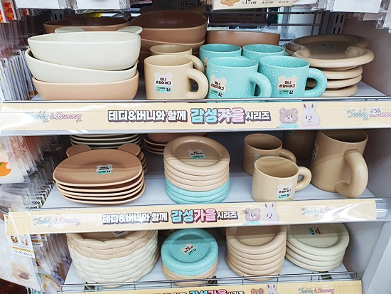 저는 이중 주방제품이 가장 눈에 들어왔습니다 아무래도 주부다 보니 그런것 같기도 하네요 갈색, 베이지, 민트색 이렇게 3가지 색상의 주방 관련 제품들이고요 특히나 둥근 접시모양의 코스터와 머그컵을 세트구성해서 구매하면 식탁 위에서 분위기내기 좋겠단 생각이 들더라고요 이거 말고 손잡이가 물방울 모양으로 된 머그컵도 있어요(진짜 귀여움) 저는 그거 사고 싶었는데 없어서 아쉬웠네요 실리콘 냄비받침은 2,000원으로 매우 저렴하고 귀여우니까 부담 없이 하나정도 살까? 하는 구매력을 얹어줍니다