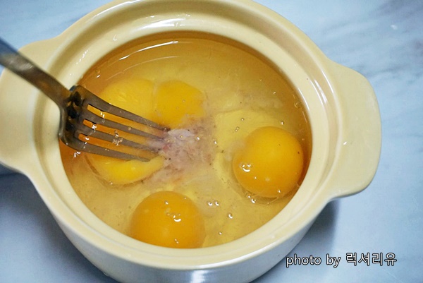서로 잘 섞이도록 저어주세요 포크를 사용하시면 계란이 잘 터지고 더욱 쉽게 물과 섞인답니다. 골고루 잘 섞어주는 게 중요한 포인트입니다.