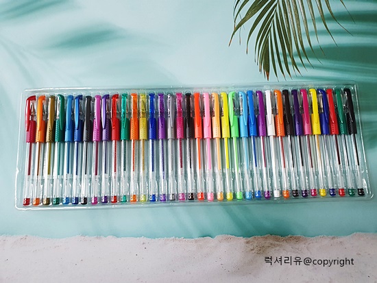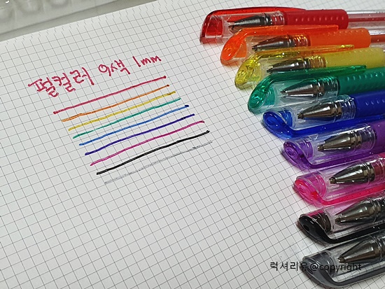 반짝거리는 펄이 들어 있어 꾸밀 때 사용하면 좋습니다 심 크기가 1mm로 두껍습니다 작은 글씨연습에는 불편한 사이즈 이므로 주로 작은 글씨에 사용하실 용도라면 다른 다이소 젤펜을 추천드립니다 저는 캘리그래피 용도로 36색을 구매한 거라서 무척 만족하고 있습니다 특히나 펄컬러는 빛반사에 의해 반짝거림이 있어어 작은 그림을 그리면서 글씨 꾸밀용도로 제격입니다 빨강, 주황, 노랑, 초록, 파랑, 보라, 자주, 검정, 회색의 9가지 색으로 구성되어 있습니다