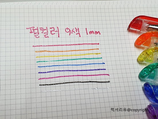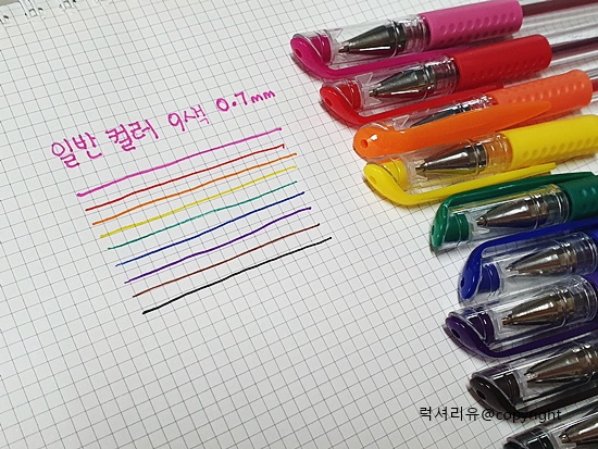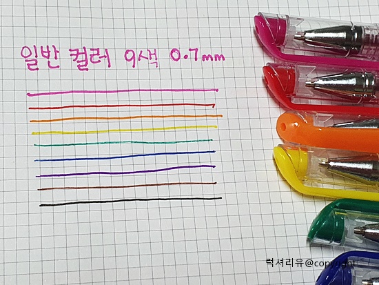 일반 컬러펜은 0.7mm로 일반적으로 0.5mm를 많이 사용하는데 비해 조금 두꺼운 두께입니다 그렇지만 필기나 웬만한 글씨에는 사용감이 괜찮습니다 검정, 브라운, 보라, 파랑, 초록, 노랑, 주황, 빨강, 핑크 이렇게 9가지 색이고요 글씨 가볍게 쓰기에 좋습니다