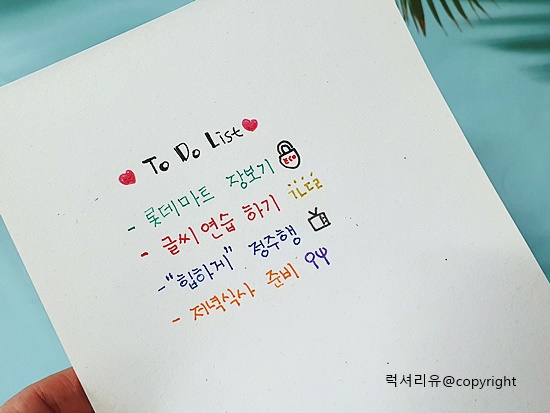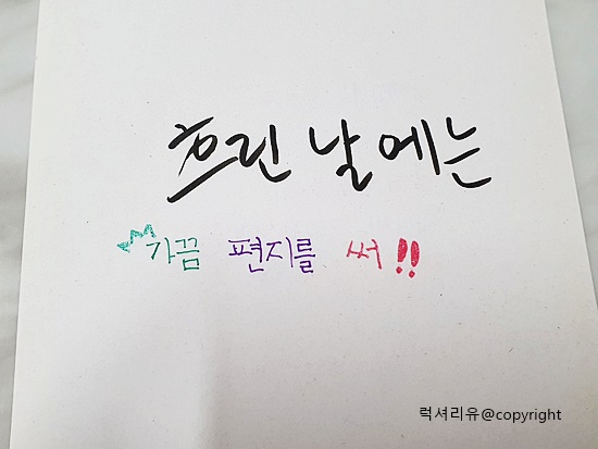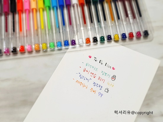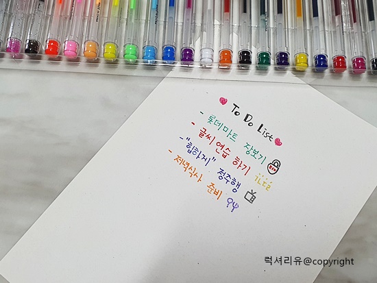 일반, 메탈, 펄 컬러색으로 예쁜글씨연습을 해보았는데요 확실히 작은 글씨체보다는 조금 크게 글씨를 써야 'ㄹ'자나 받침자 등의 디테일한 표현이 가능합니다 고로 내 글씨체가 작다면 이 제품은 비추천이고요 저처럼 캘리그래피 연습이라던지 글씨체를 크게 쓸 곳에는 강추입니다 또한 처음 쓸 때 끊김 현상이 있는데요 이럴 땐 연습장에 동그라미를 마구마구 그어주면 잘 나옵니다 36색으로 다양한 질감을 느껴보며 글씨를 쓸 수 있다는 것이 아주 매력적입니다 또한 네온컬러나 펄컬러 등의 다양한 컬러로 그림 그리기까지 도전해 볼 수 있습니다