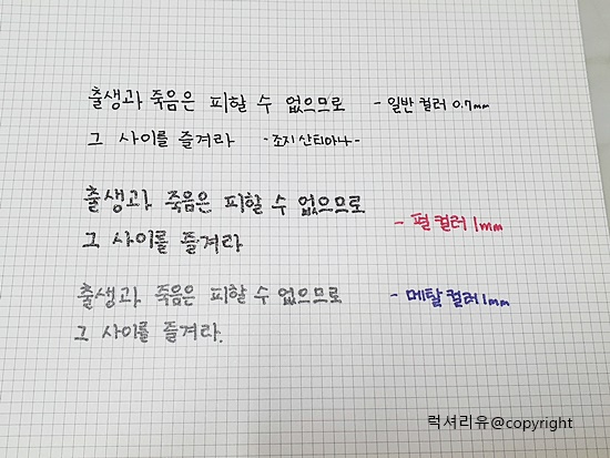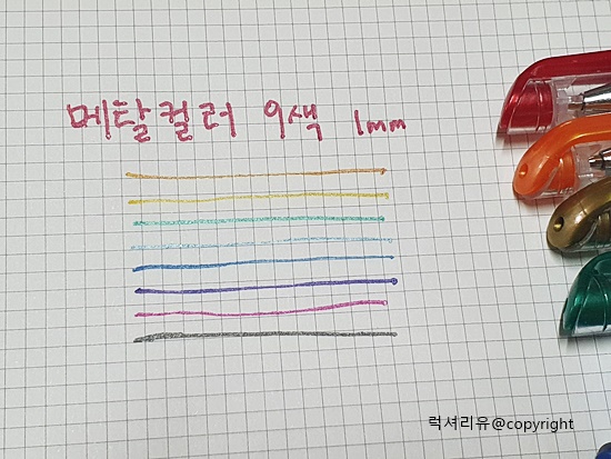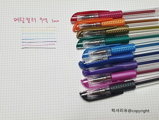 메탈 컬러 색감이 정말 궁금했는데요 일반 컬러 젤펜과 함께 써보면 극명한 차이를 보실 수 있습니다 형광등 아래에 비춰보면 메탈의 광채를 확인해 보실 수 있습니다 메탈 컬러색은 글씨 쓸 때 기분이 좋아지는 묘한 느낌이 있습니다 이건 직접 사서 확인해 보세요