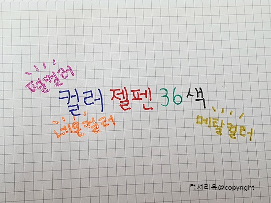 사진으로 펄과 네온 메탈의 느낌을 모두 담기에 역부족입니다 다이소 젤펜 36색 직접 구매하셔서 비교해 보세요 네온컬러는 형광펜 대신 밑줄 긋는 도구로 활용해도 좋을 것입니다 처음 사용 시에 끊김 현상 있을 수 있다는 거 예상하시고요 이는 불량이 아니니 동그라미 많이 그리셔서 길들이시기 바랍니다