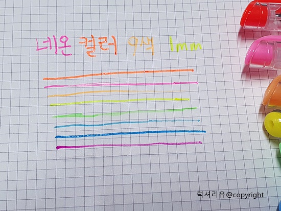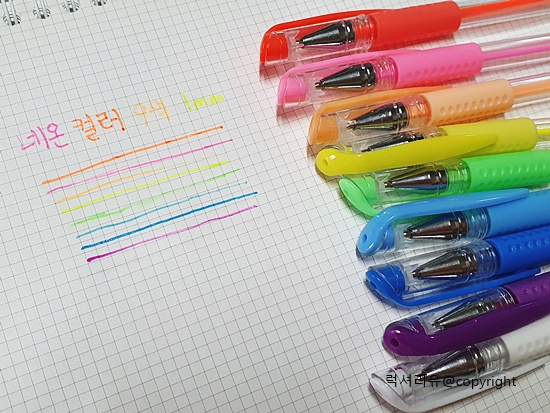 네온컬러라고 하면 조금은 생소하실 수도 있는데요 형광펜에서 나오는 그 색감이라고 생각하시면 됩니다 네온컬러 또한 꾸미는 용도나 밑줄 치는 용도 강조하는 용도로 활용하면 좋습니다 글씨체에는 선명하게 잘 보이지 않는 컬러가 몇 개 되므로 이점 유의해서 활용하시면 되겠습니다 이 또한 1mm 심을 사용합니다