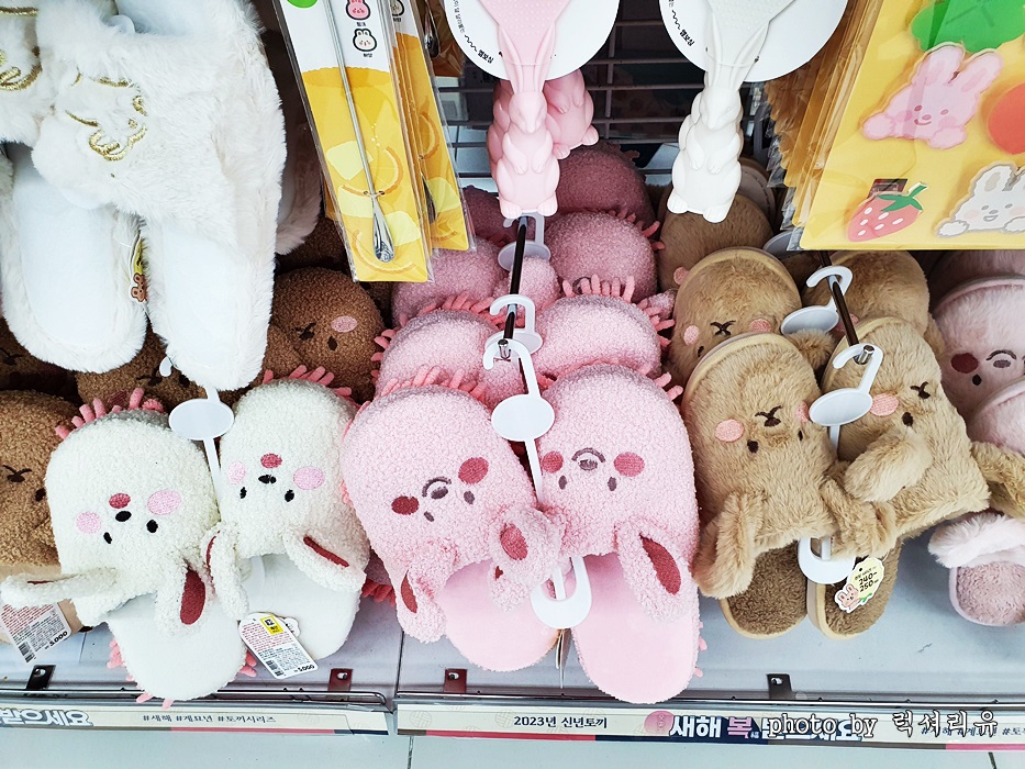 언제나 그렇듯 귀여운 토끼인형들이 한아름이고요 유리잔, 파우치, 거실화, 저금통, 편지지, 스티커,클립, 세안헤어밴드, 머리띠, 키홀더, 피겨 등등 아주 다양합니다 귀여운 거 한창 좋아할 나이의 초등학생부터 어른에 이르기까지 다양한 연령대들이 새해맞이 다이소 토끼 시리즈들을 바구니에 담는 모습들이 보였습니다 (매의 눈을 가진 럭셔리유 ㅋ) 특히나 토끼모양의 머리띠 너무 앙증맞고요 토끼거실화도 종류별로 재미납니다