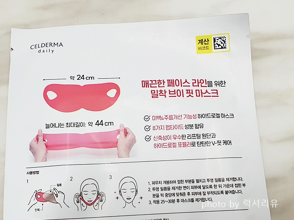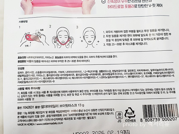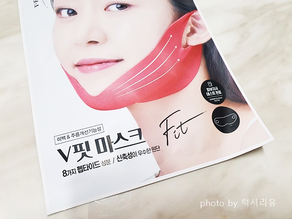 필름 뗀곳이 얼굴에 닿는 면이고요 이 안에 미백과 주름개선에 도움되는 성분들이 들어 있다고 하네요 전 처음에 다이소 V핏 마스크를 사용할때 한번만 쓰고 버렸는데요 사용해보니 관리만 잘되면 3회~4회정도는 사용가능하겠어요 리프팅 원단이 짱짱하고요 지퍼백에 넣어서 냉장고에 보관했더니 재사용시 쿨링감이 최고고 리프팅 효과가 배가 되는 기분이더라고요 그래서 다이소 팩 추천하는 이유기도 하고요 (저는 총 4회 사용하고 버렸습니다)