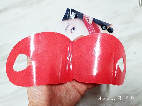 봉지를 뜯어서 내용물을 꺼내보면 접혀있는걸 볼 수 있습니다 펴게 되면 이렇게 양쪽에 귀가 들어갈 수 있는 구멍이 있고요 필름이 부착되어 있어서 필름을 떼고 턱 아래를 중심으로 끼면 부착 완료입니다