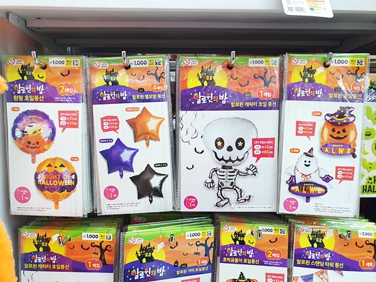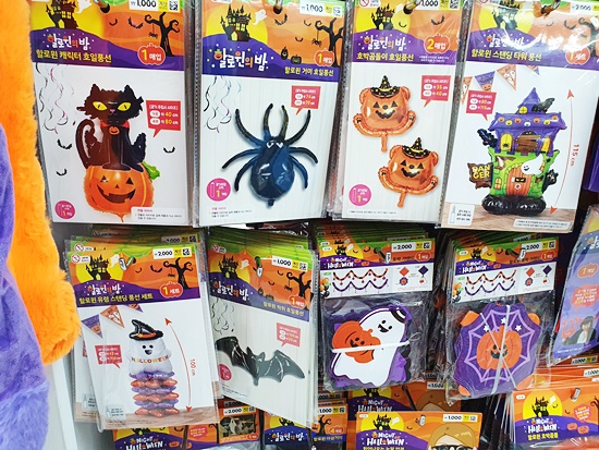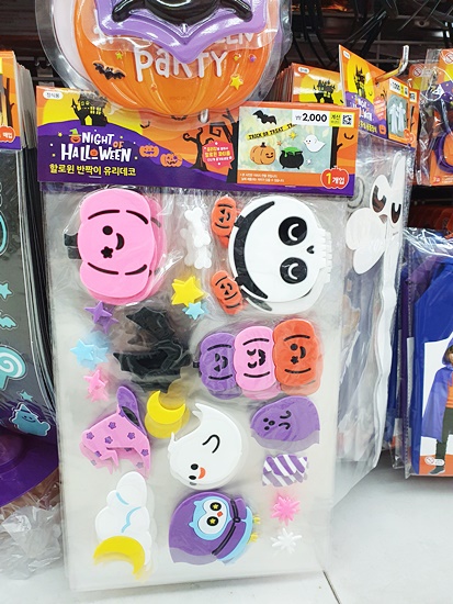 이번 시즌에서 눈여겨보아야 할 상품이 바로 풍선이 아닌가 싶은데요. 거미, 유령집, 고양이 등 재미난 디자인으로 분위기 연출하기 아주 제격일 것 같습니다. 일반적으로는 천 원대가 많고요 조금 사이즈가 크다면 많아야 이천 원대이니 여기저기 꾸밀 일 많으신 분께 강추드립니다. 또한 유리창에 붙여놓으면 손으로 떼기 전까지는 계속 붙어있을 글라스데코 아이템도 많으니 함께 연출해 보세요!