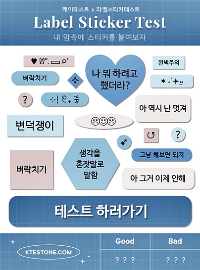 - 케이테스트 측에서 제시한 MBTI유형과 스티커명 과의 매칭 보니 저는 ISFJ라고 나오네요 조금 흥미로운 사실은 라벨스티커 테스트 연애 편에서는 ESFP가 나와서 두 검사의 성격유형이 동일하지 않구나를 알게 되었습니다 또한 자신이 처한 상황에 따라서 약간씩 달라질 수 있고 문항이 적고 답변선택이 적으므로 신뢰도의 낮음으로 인해 재미 삼아 검사해 보는 것을 추천해 드립니다