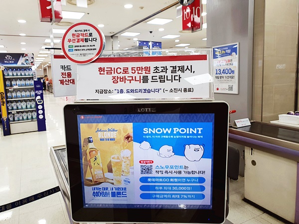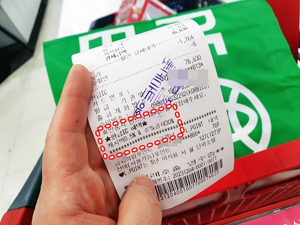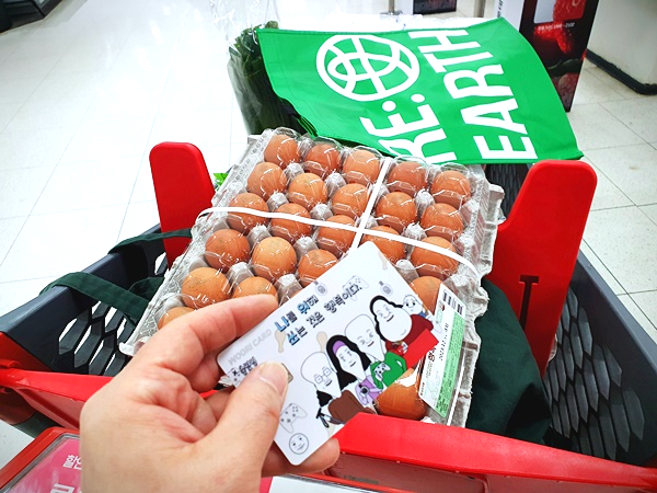 롯데마트에서 체크카드 결제 시 현금카드로 우선 결제가 된다는 문구 보셨을 거예요. 이 말은 즉, 현금 IC 카드로 결제할 경우 결제 금액의 캐시백 0.5%와 소득공제 30% 혜택을 제공해 준다는 의미를 내포하고 있습니다. 또한 5만 원 이상 초과 결제 시 에코백을 무료증정하는데요. 이는 재고 소진 시에는 종료되는 서비스입니다. 카운터에서 결제 시 직원분께서 말씀해 주시니 결제할 때 귀 쫑긋하시면 되겠습니다. (이어폰 끼시면 안내를 받을 수 없어요)