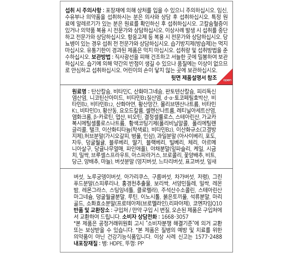 아무래도 식생활이 서구화되다 보니 많이 먹고 있다고는 하지만 영양가 있게 먹고 있지는 않죠 배달앱도 점점 발달되고요 손만 뻗치면 손쉽게 무엇이든 먹을 수 있는 요즘이지요 인스턴트식 위주의 음식들이 즐비해서 영양가와는 점점 멀어지는 것 같습니다 그렇다고 매 끼니마다 영양체크하며 골고루 챙겨 먹는건 정말 어려운 일이더라고요 그래서 이렇게 정기적으로 멀티비타민을 챙겨먹는 습관은 정말 중요한 것 같아요 한 알 안에 영양성분들이 골고루 들어 있으니까요~ 그렇다고 인스턴트식 음식은 맘 놓고 드시라는 건 아닙니다 삼시세끼 매끼 내가 어떤 음식을 먹는지 체크하며 가급적 신선한 야채를 가까이해보세요( 예: 브로콜리, 삶은 양배추 쌈, 시금치나물, 두부구이 등등 우리나라 밥상이 최고예요!)
