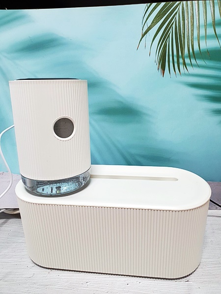 얼기설기 섞여있는 전선들과 콘센트가 안 보여서 좋고 먼지 안 타서 더욱 깔끔합니다. 디자인도 깔끔 그 자체! 윗면에 홈이 파여있어서 핸드폰 거치대로 활용해도 됩니다.