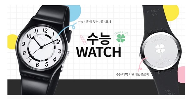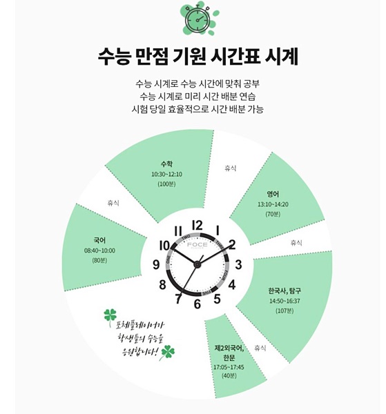 아주 독특하게 수능 시간표에 맞춰서 디자인이 만들어진 시계입니다. 뒷면에 행운을 비는 네 잎 클로버가 인상적이고요. 선물용으로도 정말 좋습니다. 시험 시간표가 한눈에 보여서 그 시간에 맞춰서 시험을 시뮬레이션하면서 연습하기에 좋고요. 실제 수능 때 사용하면 더더 좋겠죠?
