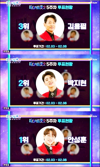 현재 1위 안성훈, 2위 박지현, 3위 김용필입니다 이중에서 1위가 나올지 다른 순위가 뒤바껴 1위가 나올지는 모르겠네요 사실 매일 온라인으로 미스터트롯2 투표 방법하는것도 중요하지만요 최종순위가 결정되어 Live로 문자 투표하는것이 반영률이 제일 높으리라 생각됩니다 결국 순위가 뒤바뀔수도 있다는것이지요
