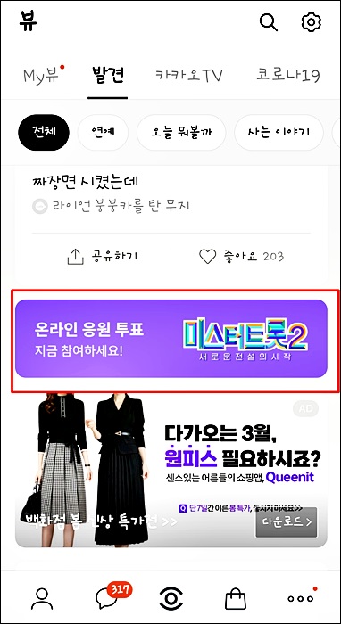 카카오톡 창을 여시면 하단에 눈모양 표시가 있는데요 그 버튼을 누르면 온라인 응원 투표라고 보라색 창이 바로 보입니다 그 보라색 창을 누르면 창이 열리며 아주 간단하게 응원이 가능합니다