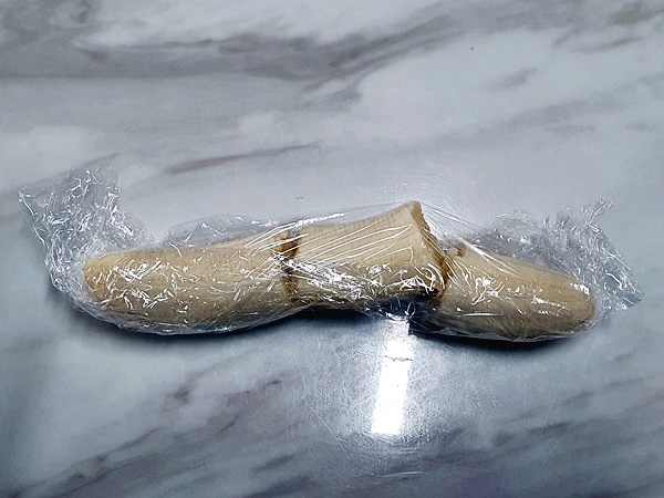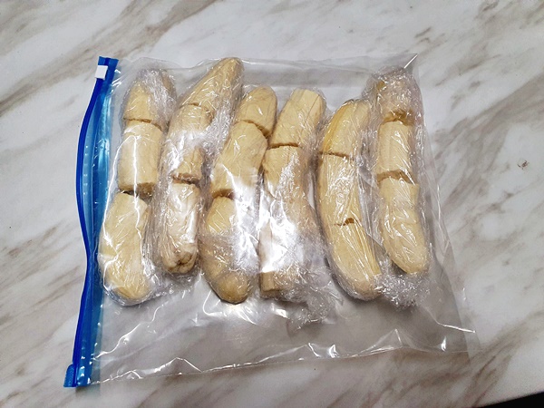 하나하나 껍질을 제거한후 랩을 깔고 손이나 칼을 이용해서 3 등분해 주세요 3 등분한 후 랩을 돌돌 말아주세요 이렇게 3 등분하는 이유는 얼려서 믹서기에 갈을 때 쉽게 갈려지게 하기 위함입니다 등분을 하지 않으면 실온에서 녹이거나 얼린 것을 힘들여 잘라야 하므로 귀찮고 힘든 과정을 줄여줍니다