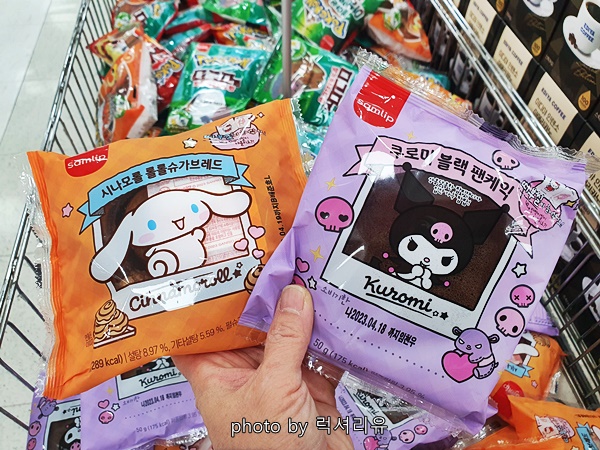 제가 구매한 것은 쿠로미 블랙 팬케익과 시나모롤 롤롤 슈가브레드 2종인데요 쿠로미빵은 팝핑캔디가 들어있어서 입안에서 톡톡 터지는 재미가 있습니다 포도크림이 들어있으니 재미 삼아 드시길 바라고요 시나모롤빵은 이름과 비슷하게 구성하여 시나몬이 들어있고요 시나모롤의 꼬리를 연상하여 롤로 돌돌 말아져 있습니다 저는 계피향이 나는 시나모롤이 더 맛있더라고요