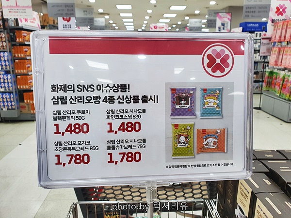 - 종류와 가격: 쿠로미 블랙팬케익 1,480원 / 시나모롤 파인코코스윗 1,480원/포차코 초당콘 톡톡브레드 1,780원/시나모롤 롤롤 슈가브레드 1,780원