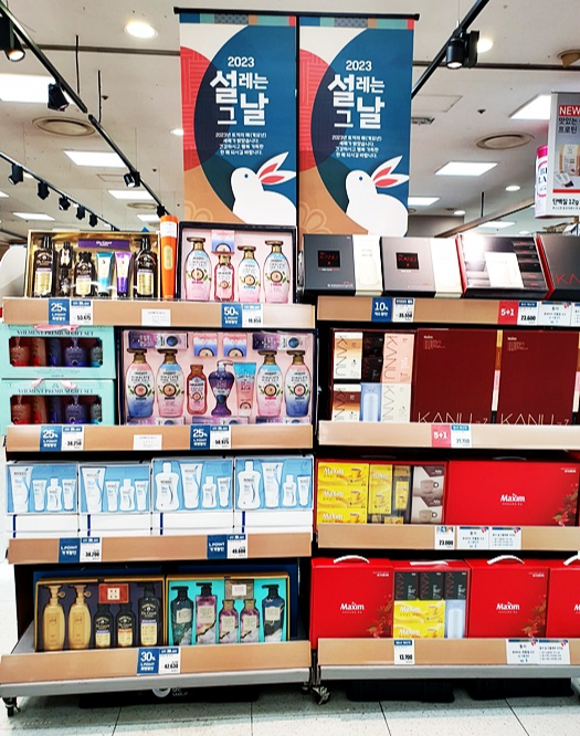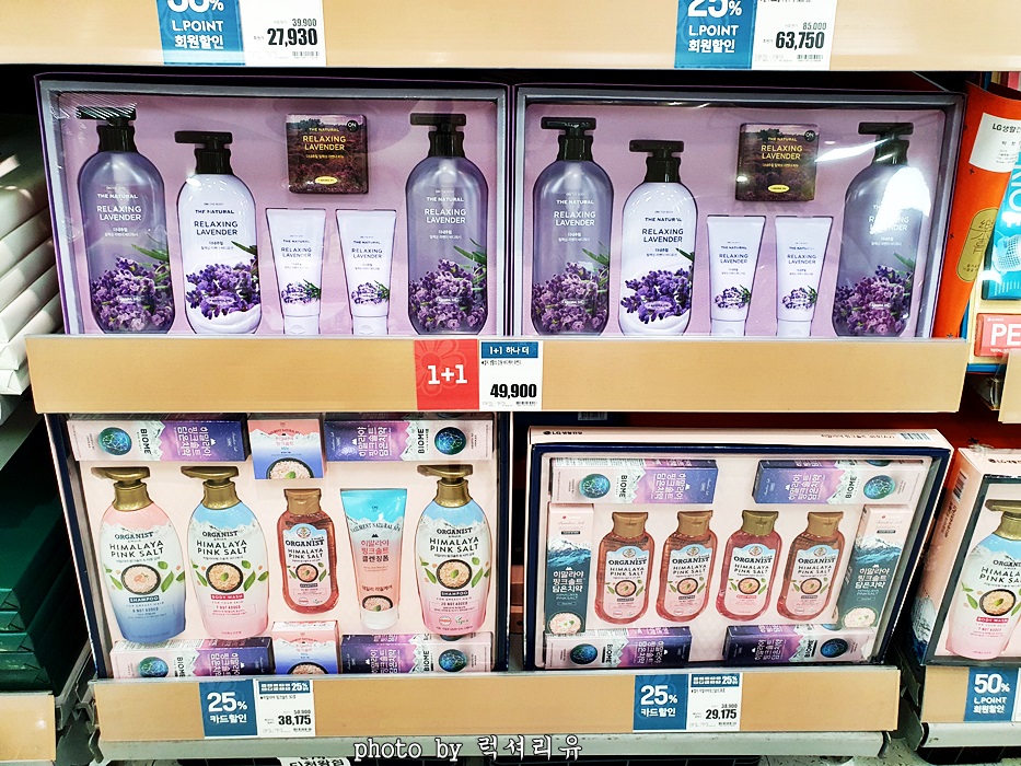 또 다른 코너로 바디클렌져, 샴푸린스, 양말 등등 생활에 관한 제품들이 눈에 띄었는데요 예전보다 좀 달라졌다고 보이는 것이 바디클렌져가 생각보다 다양한 구성이었고 포장도 고급스럽게 변했다는 점이에요 구매욕을 불태우는 디자인이 많이 보였어요 아무래도 여기저기 준비를 많이 해야 하는 명절선물이니만큼 금액 부분이 많이 부담되실 텐데요 좀 더 가볍게는 양말세트도 괜찮을것 같습니다 요즘에는 양말세트 하나도 포장을 정말 잘해서 나오더라고요 게다가 어떤 제품은 1+1으로 판매하니 좀더 많이 준비해야하는 분들에게는 희소식 되겠습니다 (거기에 포인트나 카드사별 할인도 들어가서 좀더 저렴히 구매할 수 있어요)
