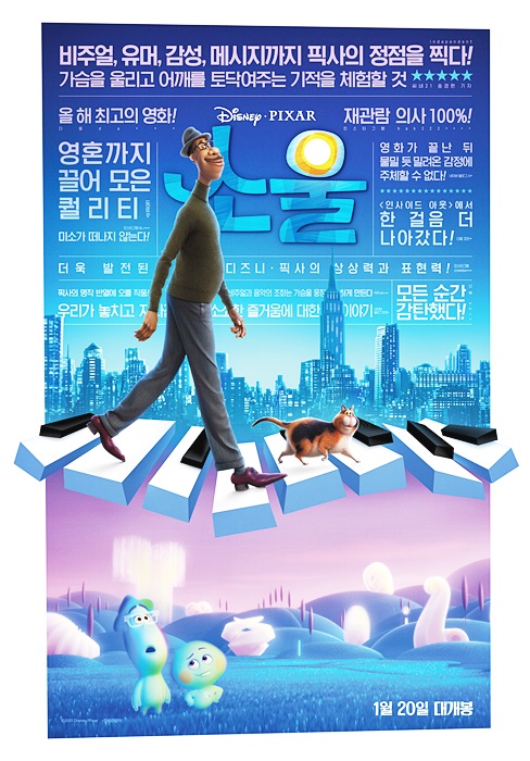영화 코코로 사후세계에 대한 주제를 다뤘다면 이번 리뷰로 소개해드릴 애니메이션 소울은 영혼에 관한 이야기라고 말할 수 있겠습니다 뉴욕의 한 음악 선생님으로 지내왔던 주인공 '조'는 꿈에도 그려왔던 최고의 밴드와 공연을 눈앞에 두고 있었는데요 공연장으로 신나게 걸어가다가 맨홀 구멍으로 빠지게 되는 어이없는 사고를 당하고는 태어나기 전 영혼의 모습인 또 다른 차원의 세상에 떨어지게 되면서 이야기가 시작됩니다 약간은 인사이드 아웃의 캐릭터들이 생각나기도 했는데요 화풍이 조금 비슷한 그런 느낌도 들었는데요 제 예리한 직감이 맞아떨어졌네요 이 부분을 살펴보니 소울 제작진이 바로 인사이드 아웃, 코코를 만든 그 제작진이라고 합니다 그러니 화풍이나 흐름이 비슷하다고 여길 수밖에 없겠어요