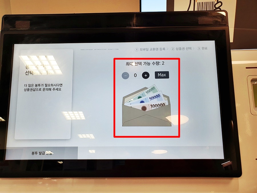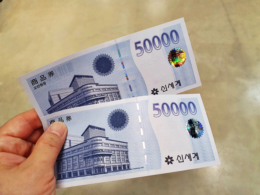 10만 원권, 5만 원권, 1만 원권, 5천 원권 이렇게 4종류가 나오는데요 원하는 것으로 바꾸세요 저는 이마트에서 5만 원 단위로 사용하기 편리해서 5만 원권 2개로 교환했습니다