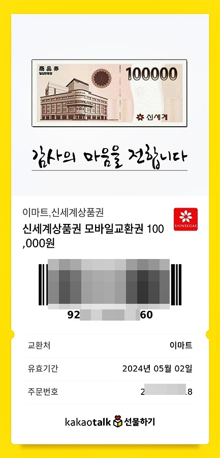 제 생일이 오월달에 있어서 이렇게 카카오톡으로 신세계상품권 모바일교환권 십만 원권을 받으니 부자 된 것 같고 아주 마음이 풍요로워지네요 저는 이걸 두 군데나 받아서 하늘이 날아갈 듯이 기뻤습니다 이상 이마트 교환하는법에대해서 알아보았는데요 큰 도움이 되셨기를 바랍니다