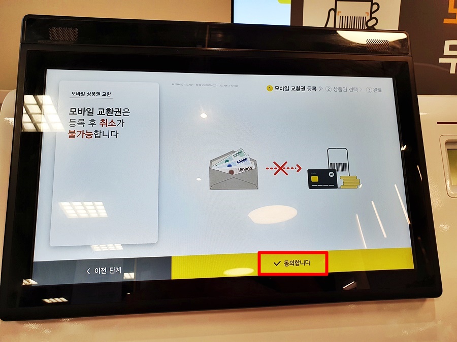 모바일 교환권은 등록 후에 취소가 불가능하다는 문구를 먼저 확인해 주세요 동의하지 않다면 이전단계를 누르시고 지류로 교환하시고 싶다면 동의합니다에 체크해 주세요