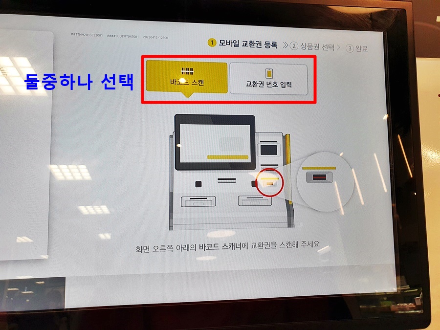 신세계상품권 모바일교환권에 저장되어 있는 바코드로 스캔할 것이냐, 교환권 번호로 입력할 것이냐는 말풍선 2개가 뜨는데요 당연히 바코드로 빠르게 스캔하는 게 더욱 편리하겠죠? 스캔이 잘 안 된다면 바코드 아래에 있는 12개의 숫자를 꼼꼼히 번호로 입력해 주시면 되겠습니다
