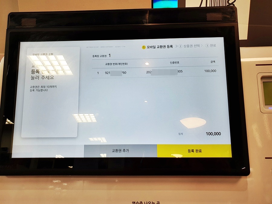 스캔하거나 번호를 입력했다면 이렇게 교환권 개인번호와 인증번호 금액이 나옵니다 하단 노란 버튼의 등록완료를 눌러주세요