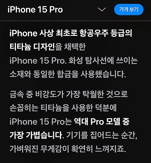 1. 특히나 iphone 15 프로와 프로맥스급에서는 역대급으로 가벼워진 것을 확인해 볼 수 있는데요. 티타늄으로 사용된 것을 알 수 있습니다. 프레임을 화성 탐사선에 쓰이는 소재와 동일한 합금으로 사용했기에 더욱 가볍고 더욱 강도가 튼튼해졌다는 것을 실감할 수 있겠습니다.