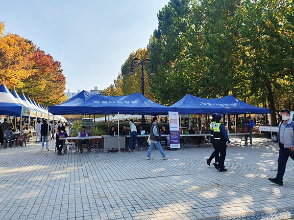 저기 파란부쓰 보이시죠? 천막에 알뜰 나눔 장터라고 쓰여있는 곳! 여기가 바로 신청서 배부하고 자리 추첨받는곳입니다. 위치 모르시면 물어서 오세요.