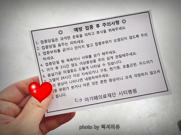 접종 후에는 주의할 것이 있는데요 접종당일 과격한 운동을 피하고 휴식을 충분히 해야 합니다 (음주삼가) 접종부위를 긁거나 오염되지 말아야 하고요 접종당일 접종부위가 짓무르지 않도록 탕 목욕이나 샤워를 삼가야 합니다 ( 접종부위에 닿지 않도록 샤워하는 건 가능) 몸살기운이나 미열이 드물게 발생할 수 있고요 만약 24시간 이상 고열이 지속되거나 구토, 호흡곤란, 두드러기 증상이 나타난다면 서둘러 병원에 가셔야 합니다 접종부위가 붓는 증상은 흔한 증상이므로 걱정하지 않으셔도 됩니다