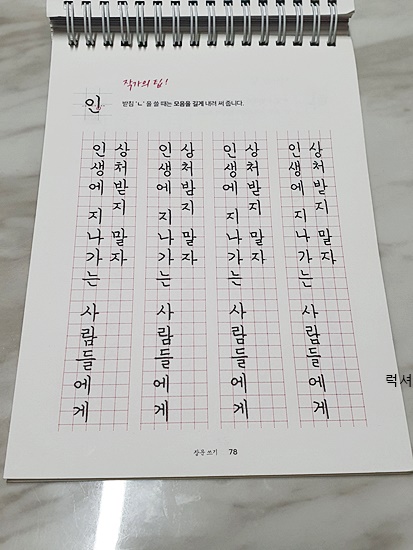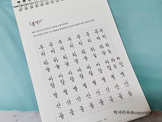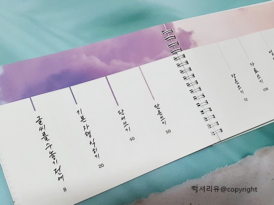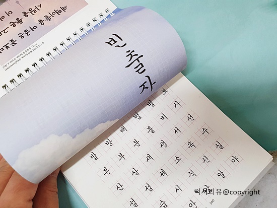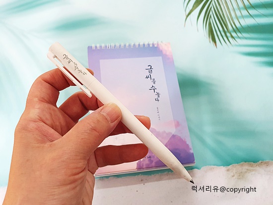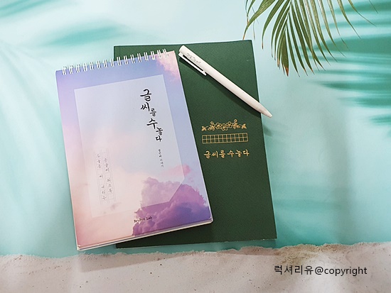 인터넷에 정말 많은 교본들이 있었음에도 불구하고 이 교본을 고르게 된 이유는 예쁜 글씨체 연습하기에 최적화된 교본이라는 생각이 들었답니다 어떤 교본은 따라 적기 힘들게 되어 있는가 하면 어떤 교본은 보는 것만으로도 부담스럽고 지루한 느낌을 주는 교본이 있었기에 말이죠. 스프링으로 되어 있어 각도의 방해 없이 편안하게 쓸 수 있다는 점도 아주 좋았습니다. 함께 동봉된 젤펜은 다 쓰면 재구매하고 싶을 정도고요
