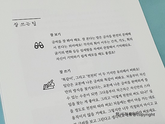 처음 맨 앞장에 보시면 쓰기전에 주의해야 할 사항과 꼭 알아야 할 사항, 잘 쓰는 팁에 대해서 적혀있는데요. 이 부분은 꼼꼼하게 읽으시면 좋습니다. 글자를 따라쓸때 '천천히' '똑같이'는 기본 베이스고요, 글씨연습이 몸에 배어 있지 않으면 포기하기 쉬우니 매일 조금이라도 글씨를 써보는 것이 제일 중요하답니다 잘 안써지는 획이나 글자는 많이 써서 손에 익혀놓으면 훨씬 수월해지고요