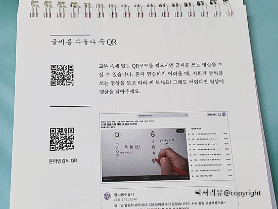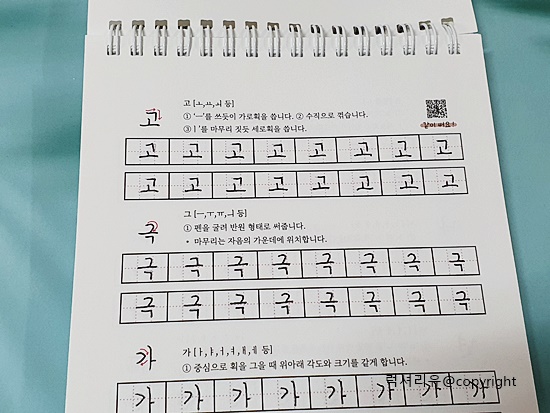 하다 보면 중간중간 큐알코드를 볼 수 있는데요. 이 큐알코드를 찍으면 직접 글씨 쓰는 영상을 볼 수 있으니 공부가 꽤 되실 거예요. 물론 책 페이지마다 큐알코드가 다 있지는 않지만 그래도 이 정도면 많이 설명해 준 것 같아 도움 되더라고요.