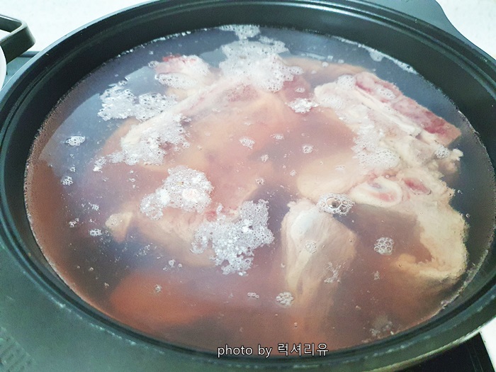 냄비에 핏물 뺀 뼈가 물이 잠길 정도로 하고 팔팔 끓여줍니다 끓고 나서 5분 후에 끓였던 물은 버리고 뼈는 찬물에 한 개씩 씻어줍니다 그렇게 해야 잡내가 나지 않고 깔끔한 국물이 됩니다