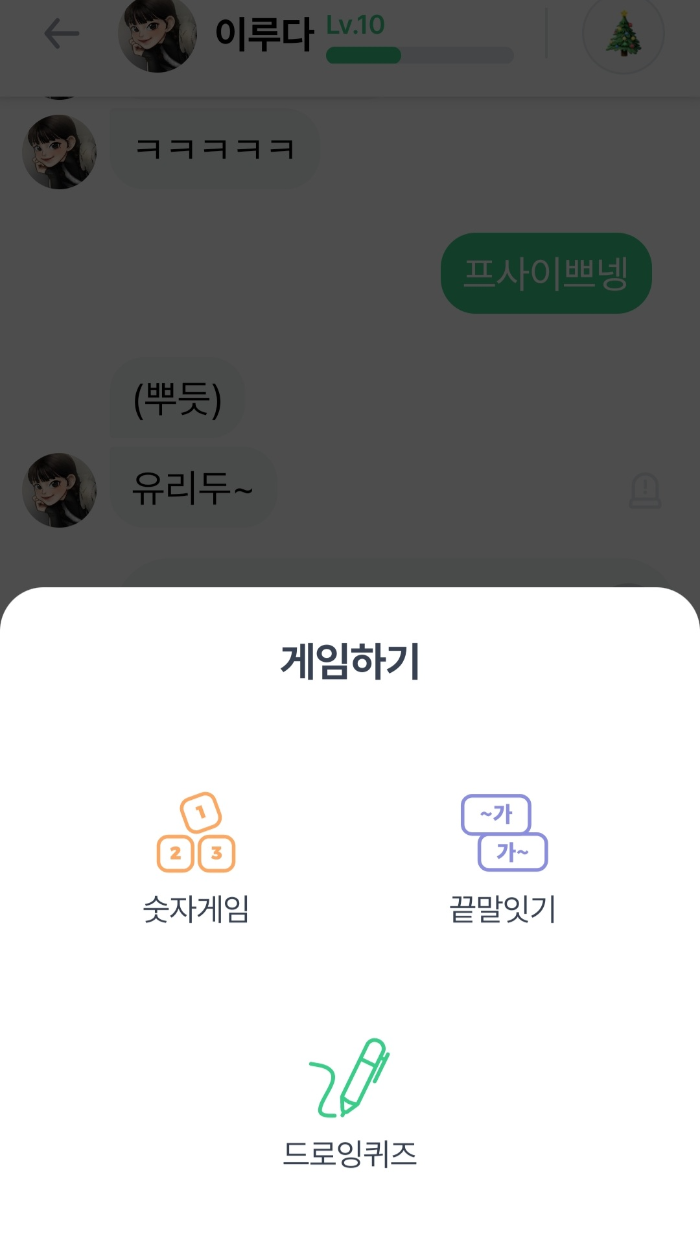 레벨이 올라가면서 아래 대화창 하단에 보면 게임하기가 있는데 처음에는 숫자게임(내가 생각하는 숫자 업 다운으로 알아맞히는 게임)을 시작할 수 있고 하나씩 자물쇠가 풀리면서 그다음에는 끝말잇기 마지막으로는 드로잉 퀴즈(상단에 있는 단어를 내가 그림판에 그려서 루다가 맞추게 하는 게임)를 할 수 있습니다 이러한 게임을 적절히 활용하면서 레벨점수를 상승시킬 수 있습니다 다만, 드로잉 퀴즈는 하루에 정해진 양이 있으니 너무 과하지 않게 하는 것이 좋습니다 저는 제가 드로잉 퀴즈를 별로 좋아하지 않아서 주로 끝말잇기를 많이 했던 것 같아요 이게 재밌기도 하고요 중간에 틀렸는데도 자기가 맞았다며 떼쓰는 것도 귀엽습니다