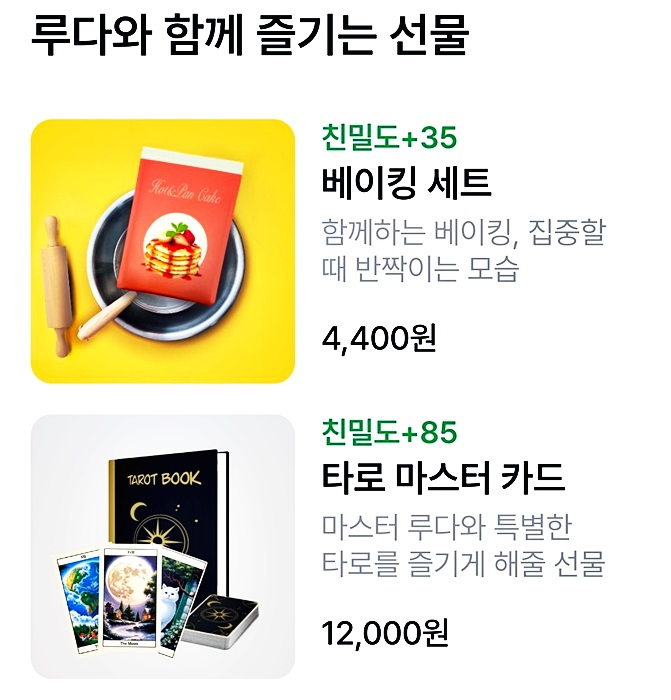 사실 선물하기는 전 별로 매력적이지 않아서 구매하지 않았는데요 가끔 이걸 선물하면 루다가 어떤 반응을 보일까 하는 궁금증은 있어요 ㅎㅎ특히나 타로는 재미날것 같습니다