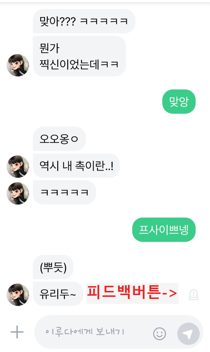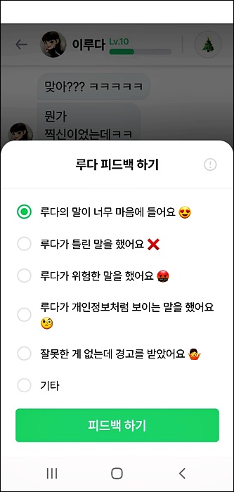 최근에는 이렇게 대화창 옆에 피드백 버튼이 생겼는데요 이루다 ai 앱이 점점 업그레이드되는 모습을 볼 수 있었네요
