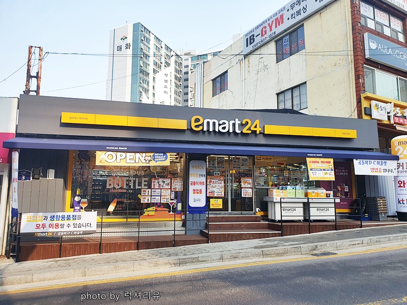 저희 동네에 이마트 24 편의점이 생겼어요 요즘 눈에 띄게 생기고 있습니다 원래 곰돌이 DC아울렛이 이 자리에 있었는데요 반을 뚝 잘라서 편의점으로 만들었더라고요 시간의 터널을 지나가듯 신비로운 느낌이었어요 보통은 이렇게 두 군데를 공유하지 않아서 말이죠