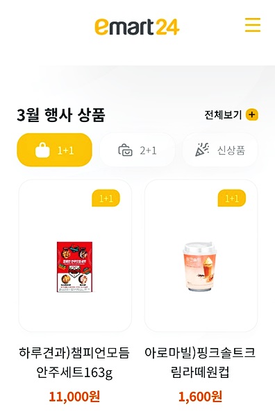 생각보다 품목이 엄청 많아서 다 캡쳐하질 못했습니다 1+1에서 2+1 신상품 등 다양한 상품들이 홈페이지에 올라와있네요
