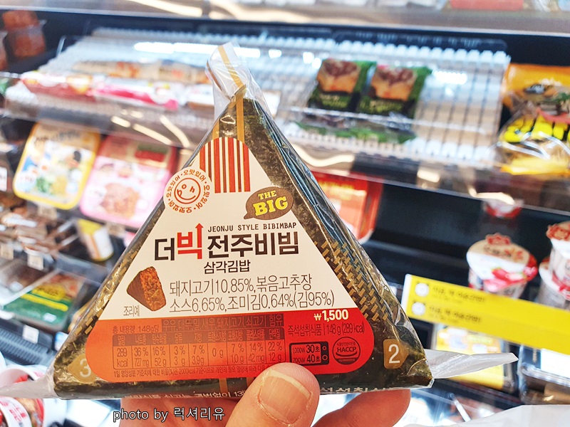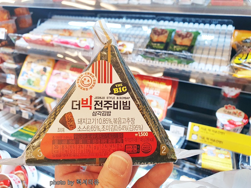 함께 이곳을 찾아온 그녀님의 픽! 더빅 전주비빔 삼각김밥1개를 득템 하셨습니다 사이즈가 다른 것보다 크고요 1개에 1500원이었어요 도시락 싸가지 못한 날 삼각김밥이랑 컵라면 조합으로 한번 먹어봐야겠습니다 삼각김밥은 가끔 한 번은 먹고 싶어 지더라고요 우리 그녀님은 집으로 들어가셔서 너구리와 함께 곁들여 야무지게 드셨습니다