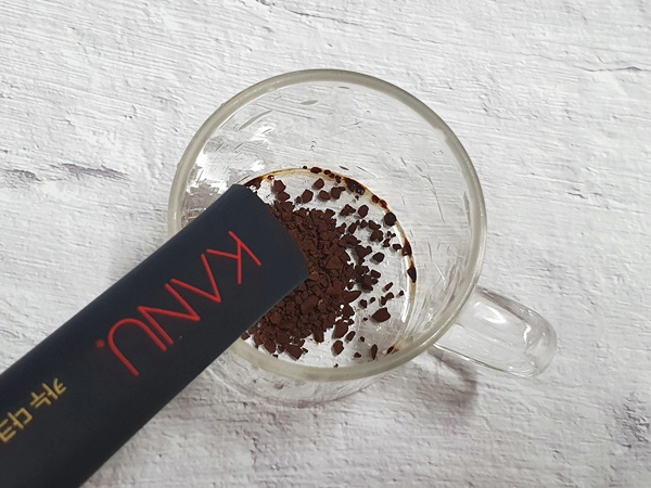 1) 카누 1 스틱을 컵에 담아 약 20ml 정도의 뜨거운 물을 넣고 녹여줍니다 (찬물에도 우러나긴 하지만 뜨거운 물에 훨씬 더 빠르게 녹습니다)