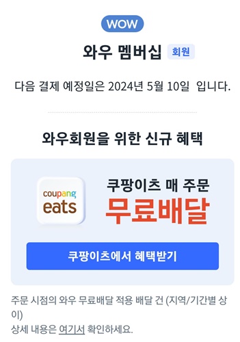 ▶이에 따른 혜택 : 무료배송, 무료반품, 새벽배송, 로켓직구 무조건 무료배송, 로켓프레시 신선식품 (15,000원 이상 무료배송) , 와우전용 할인가, 로켓배송상품 30일 이내 무료반품, 쿠팡플레이 무료시청, 쿠팡이츠 무료배달 (기존과 같은 혜택임)
