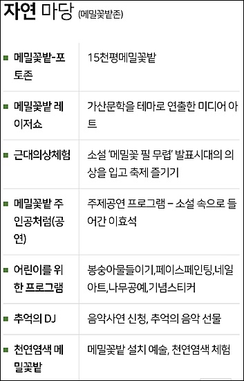 시간대별로 진행되는 '메밀꽃필 무렵"애니메니션과 영화상영 등 이 시간대가 아니면 볼 수 없는 시간대별 행사들 꼼꼼히 살펴보시고요 동선을 미리 계획하시는 것도 좋겠어요