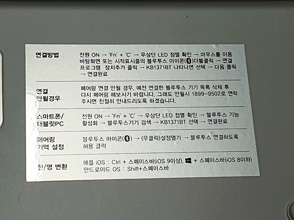 연결방법은 제품 하단에 큰 잘 보이게 적혀있습니다 먼저 건전지를 넣어 작동 on 시킨 후 순서에 따라 장치 추가를 하시면 바로 사용할 수가 있습니다 윈도 안드로이드 애플 구별 없이 사용이 가능하므로 걱정 없습니다 동시에 3개의 스마트기기를 연결할 수 있으니 신세계입니다