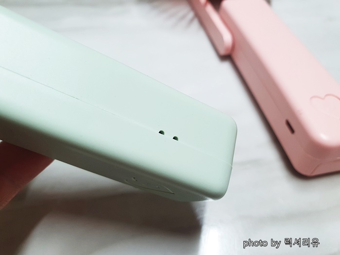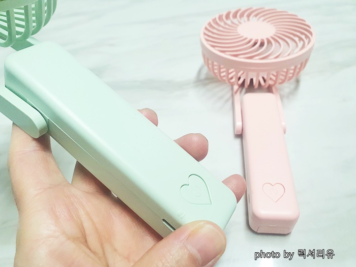 손잡이에서 보이는 하트를 꾹 누르면 휴대용 선풍기 작동이 시작됩니다 (처음에 설명서를 제대로 안 보고 엄청 당황했었답니다) 한 번 더 누르면 2단계 또 한번 더 누르면 3단계까지 단계가 조절돼요 저는 1단계에서 2단계만 사용하는데요 그 이유는 그렇게만 해도 시원하기 때문입니다 충전은 5핀 충전이고요 충전 케이블이 함께 들어있어서 동봉된 케이블로 사용하시면 됩니다 충전 중일 땐 옆라인에 빨간불이 보이고요 완충일 때는 파란불로 바뀝니다 (대부분은 완충 시 초록불로 바뀌는데 이건 정말 파란불이랍니다)
