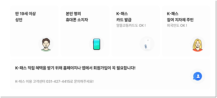 만 19세이상 성인이면서 본인 명의의 휴대폰을 소지하고 있어야 하며 (인증절차필요) K-패스 카드(또는 기존 알뜰교통카드)를 발급받은 시민이면 가입이 가능합니다 (K-패스 참여 지자체 주민/외국인도 가능)